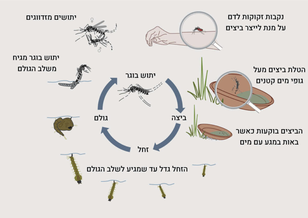 – שימוש בתכשירים דוחי יתושים – מונע עקיצות ביעילות, יש להקפיד למרוח את כל הגוף כי היתושים האלה לא מוותרים בקלות.